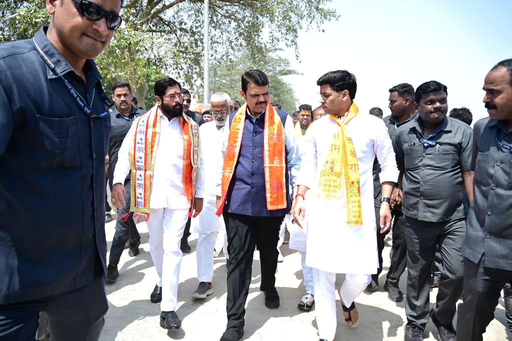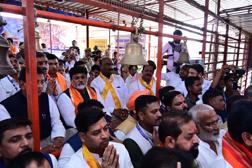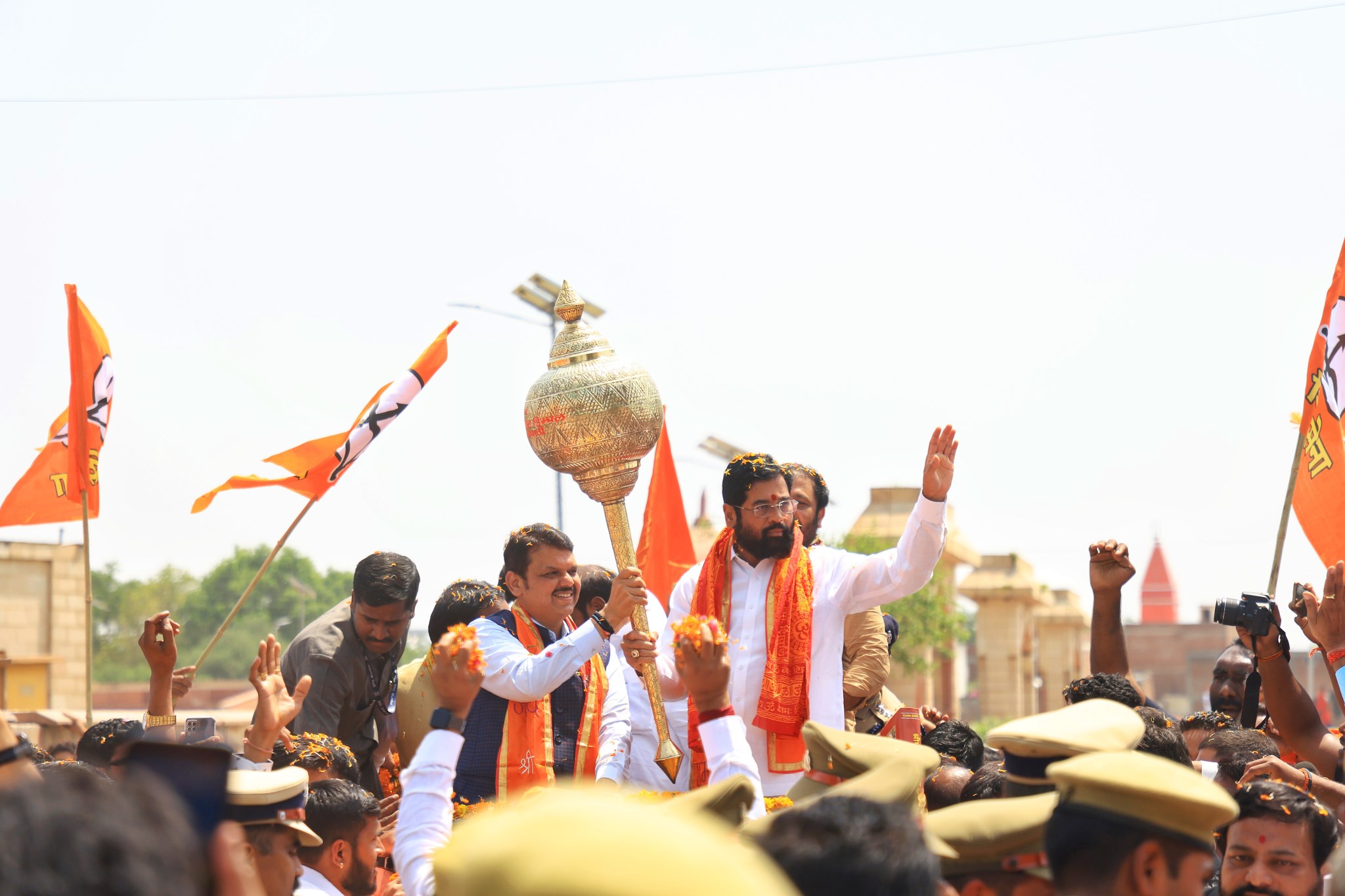 राज्याचे मुख्यमंत्री एकनाथ शिंदे आणि उपमुख्यमंत्री देवेंद्र फडणवीस यांनी सोबत हनुमानाची गदा उचलून अयोध्येच्या जनतेचे अभिवादन केले