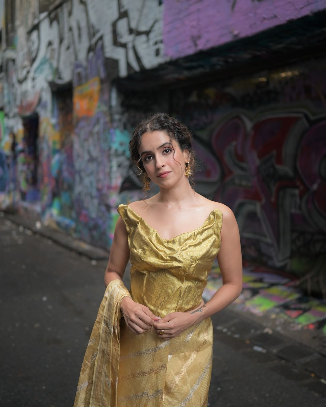 सान्या मल्होत्राने तिच्या सोनेरी पिवळ्या पारंपारिक साडीला एक मोठे अपग्रेड केले. समृद्ध रेशमी साडी ला पारंपारिक लूक देऊन कॉर्सेट साडीला मॉडर्न लूक एकदम स्टँडआउट झाला.