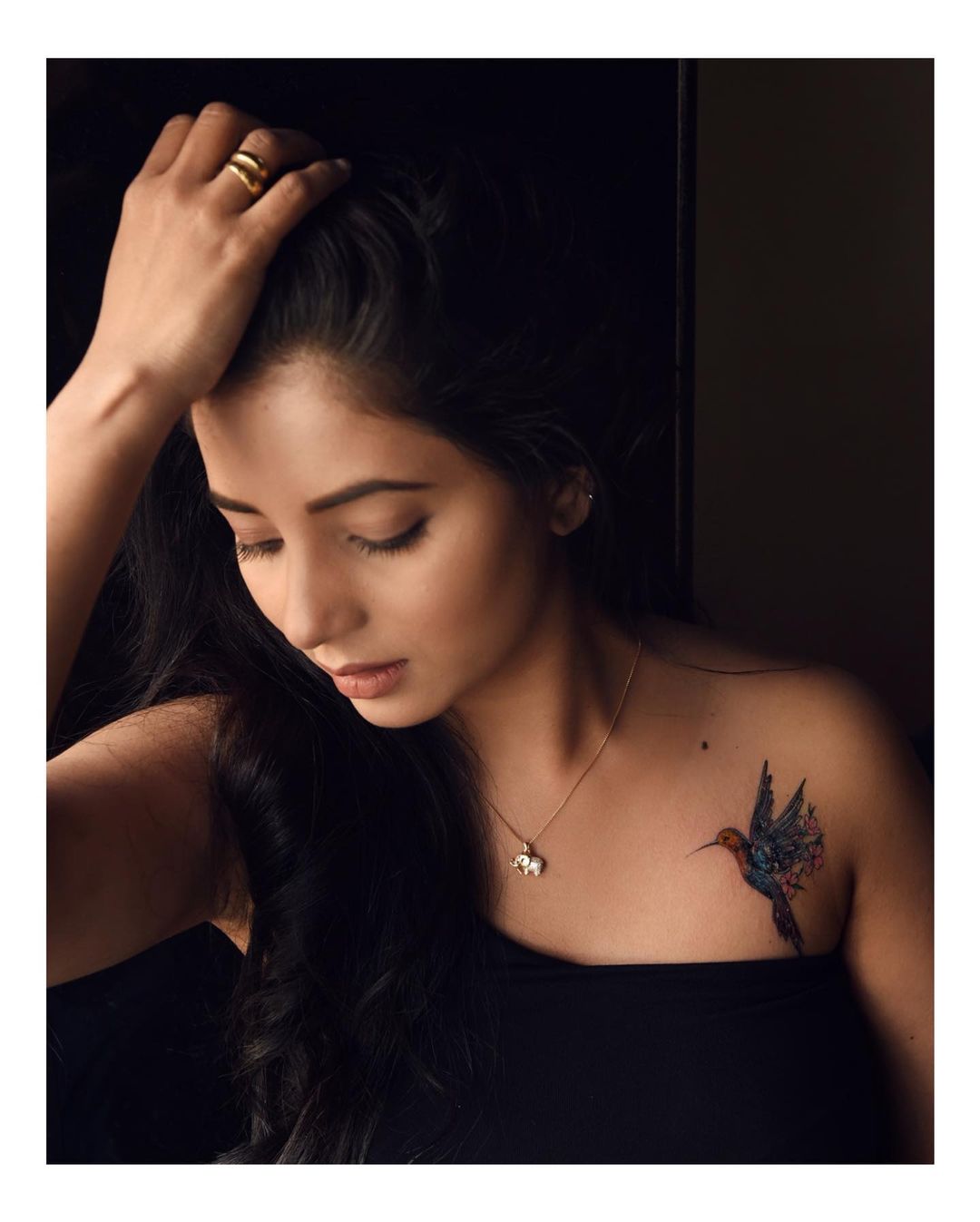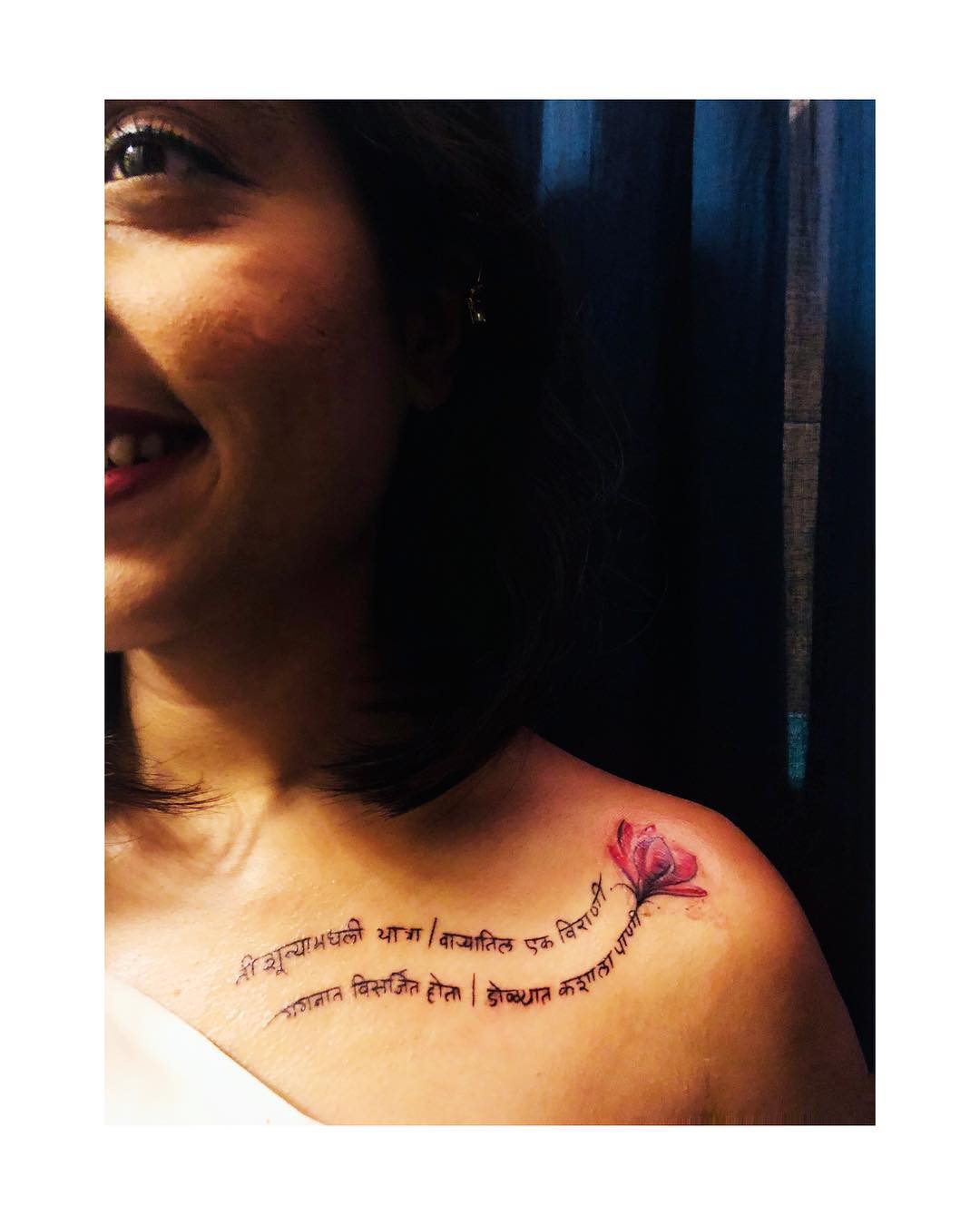 तर अभिनेत्री सखी गोखलेने खांद्यावर काढला पक्षाचा टॅटू. हा टॅटू तिने कवी कुसुमाग्रजांची कविता लिहिली आहे.