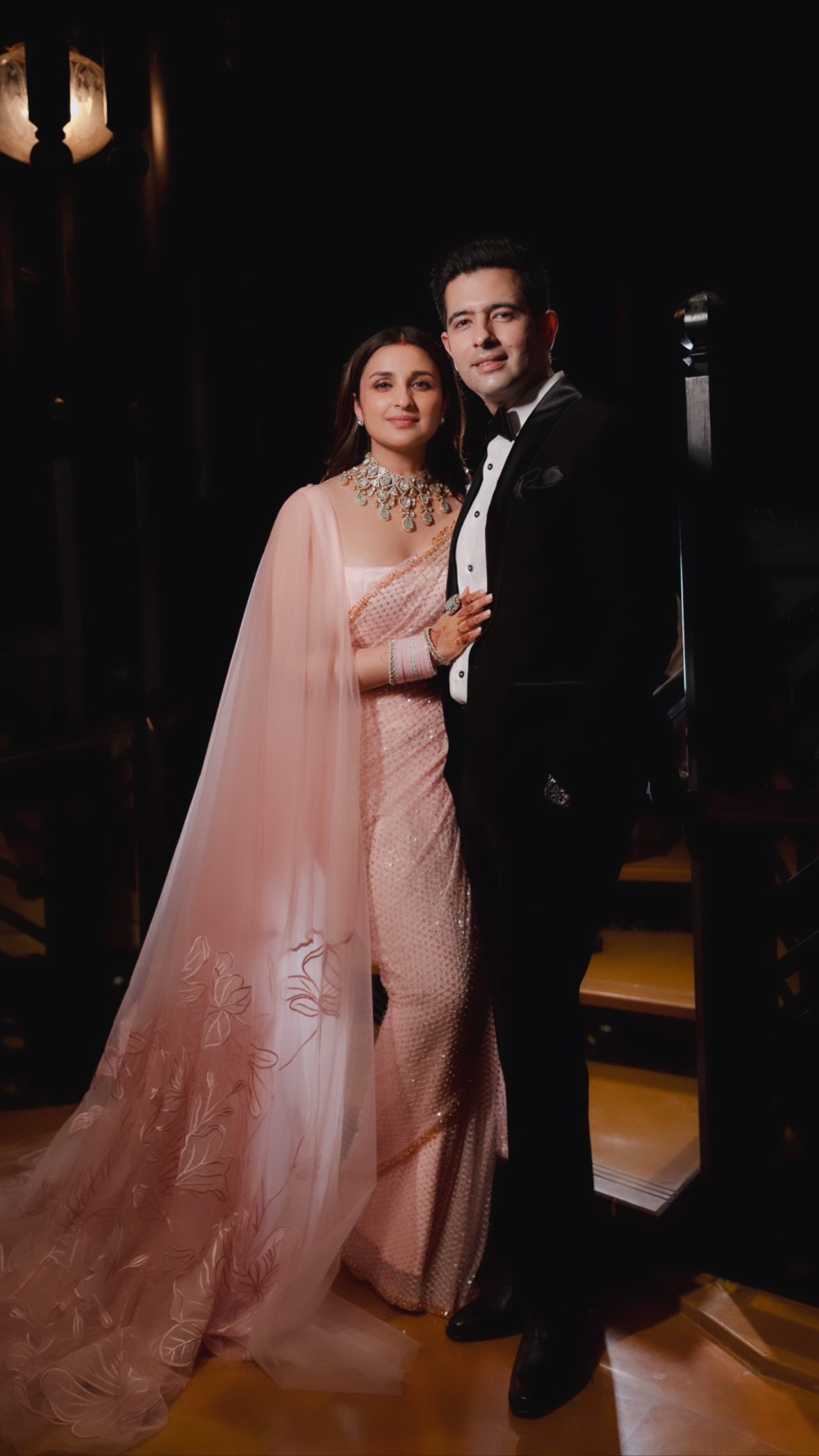 या फोटोंमध्ये परिणीतीने Rosette Blush crystal sequin साडी परिधान केली आहे. त्याचबरोबर यामध्ये राघव चढ्ढा देखील तिच्यासोबत दिसत आहेत.