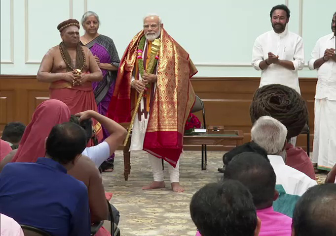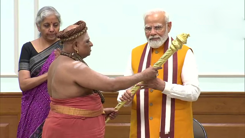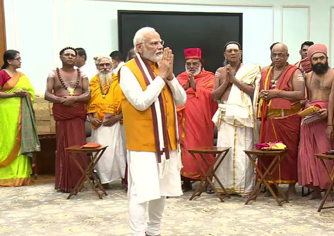नवीन संसद भवनाच्या उद्घाटनाच्या पूर्वसंध्येला पुरोहितांनी पंतप्रधान नरेंद्र मोदींना 'सेंगोल' (राजदंड) सुपूर्द केले.