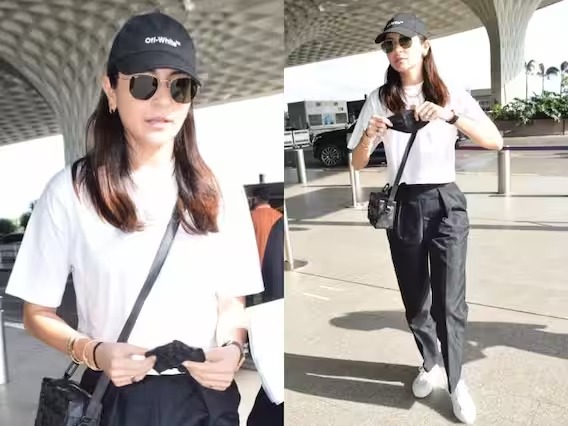 एअरपोर्ट लुकसाठी अनुष्काने काळ्या पँटसोबत पांढरा टी-शर्ट आणि कॅप घातली होती. तिने तिच्या कॅज्युअल लुकसह काळा गॉगल घातला होता ज्यामुळे तिचा लुक खूपच डॅशिंग झाला होता. यासोबतच अनुष्काने पांढऱ्या रंगाचे स्नीकर्सही घातले होते.