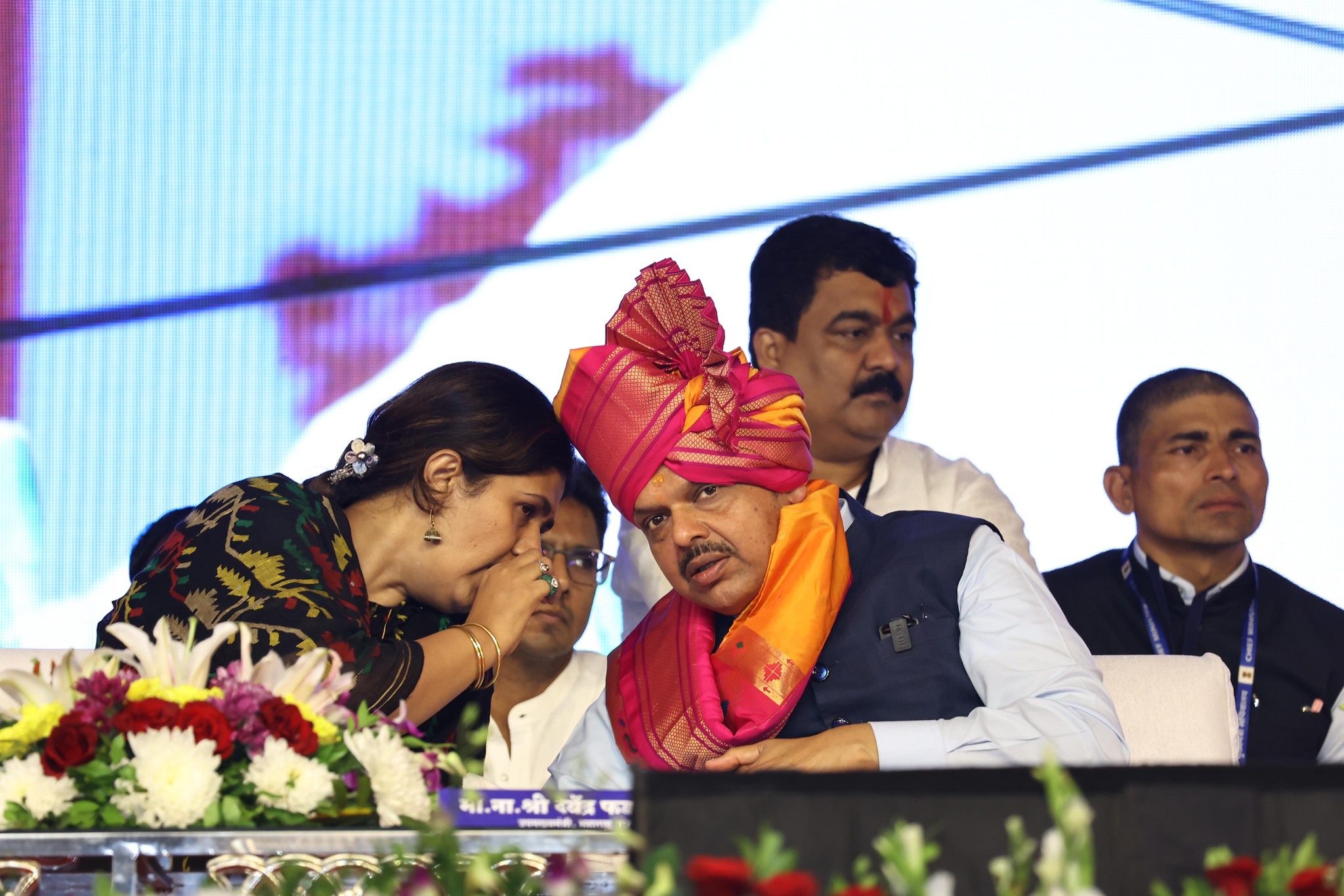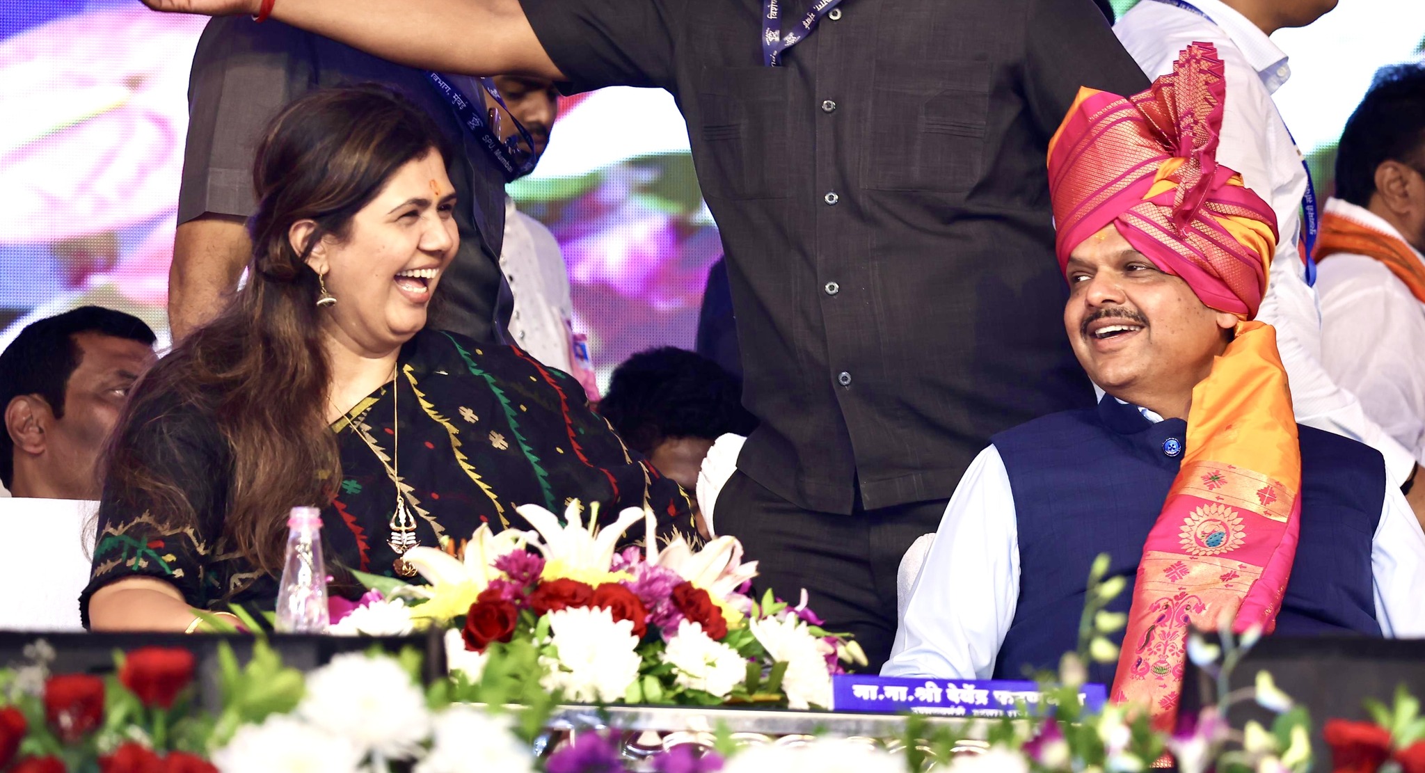 यावेळी भाजपमध्ये नाराज असलेल्या पंकजा मुंडे आणि इतके दिवस त्यांचे विरोधक असलेले धनंजय मुंडे हे एकाच व्यासपीठावर आले होते. त्यावेळी फडणवीसांनी त्यांची नाराजी दूर करत दोघांमध्ये समेट घडवण्याचा प्रयत्न केला.