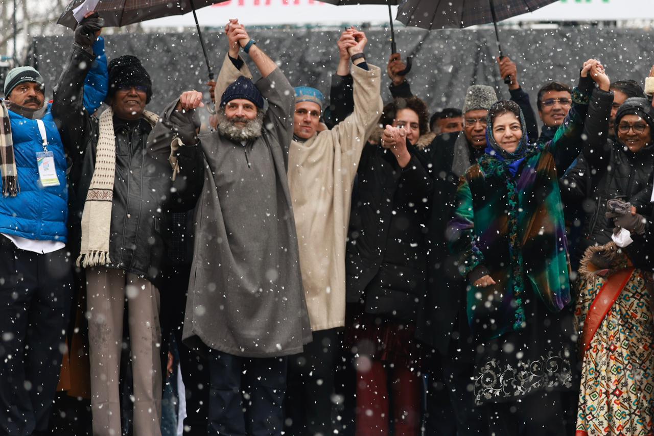 बर्फवृष्टीमध्येही राहुल गांधी यांनी आपलं भाषण सुरू ठेवलं.