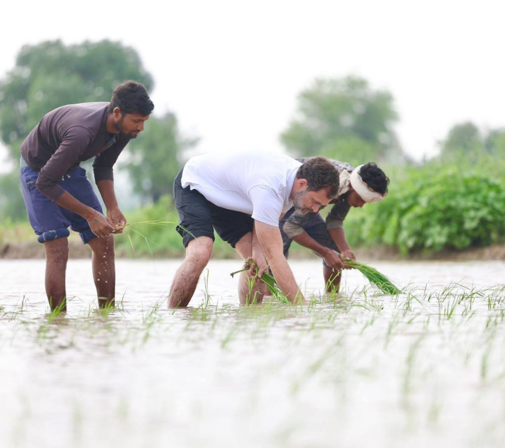 राहुल गांधी यांनी सकाळी सातच्या सुमारास मदिना आणि बडोदा गावात शेतकऱ्यांसमवेत भाताची लागवड केली.