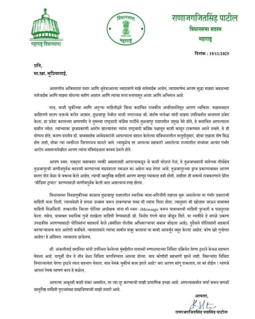 Ranajagjitsinha Patil On Supriya Sule Tuljapur Drug Case : तुळजापूर ड्रग्ज प्रकरणातील आरोपींना भाजपाने पक्षप्रवेश दिल्याचा आरोप राष्ट्रवादी काँग्रेसच्या शरद पवार गटाच्या खासदार सुप्रिया सुळे यांनी केला होता. यावर भाजपचे आमदार राणाजगजितसिंह पाटील यांनी पत्र लिहित प्रत्युत्तर दिले आहे. तुम्ही केलेले आरोप चुकीचे आणि अपुऱ्या माहितीद्वारे किंवा राजकीय अपरिहार्यतेतून केल्याचं राणाजगजितसिंह पाटील यांनी म्हटलं आहे. तुळजापूरचे माजी नगराध्यक्ष संतोष परमेश्वर भाजपात प्रवेश करण्याच्या क्षणापर्यंत राष्ट्रवादीमध्येच होता असा दावा देखील राणाजगजितसिंह पाटील यांनी केला आहे.
