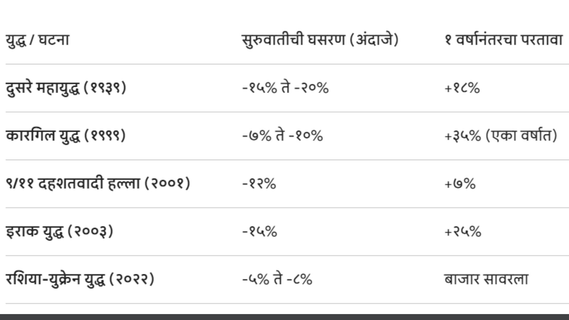 “Buy on the cannons, sell on the trumpets.” अर्थात, जेव्हा युद्धाच्या तोफा धडाडतात तेव्हा खरेदी करा आणि जेव्हा विजयाचे बिगुल वाजते म्हणजेच सगळं आलबेल होतं तेव्हा विक्री करा असे प्रसिद्ध गुंतवणूकदार नॅथन रॉथचाइल्ड यांचं वाक्य आहे. त्यामुळे आतापर्यंतचा इतिहास बघता प्रत्येक युद्धाच्या धक्क्यातून भारत आणि भारतीय बाजार अधिक मजबूत होऊन बाहेर पडले आहेत.