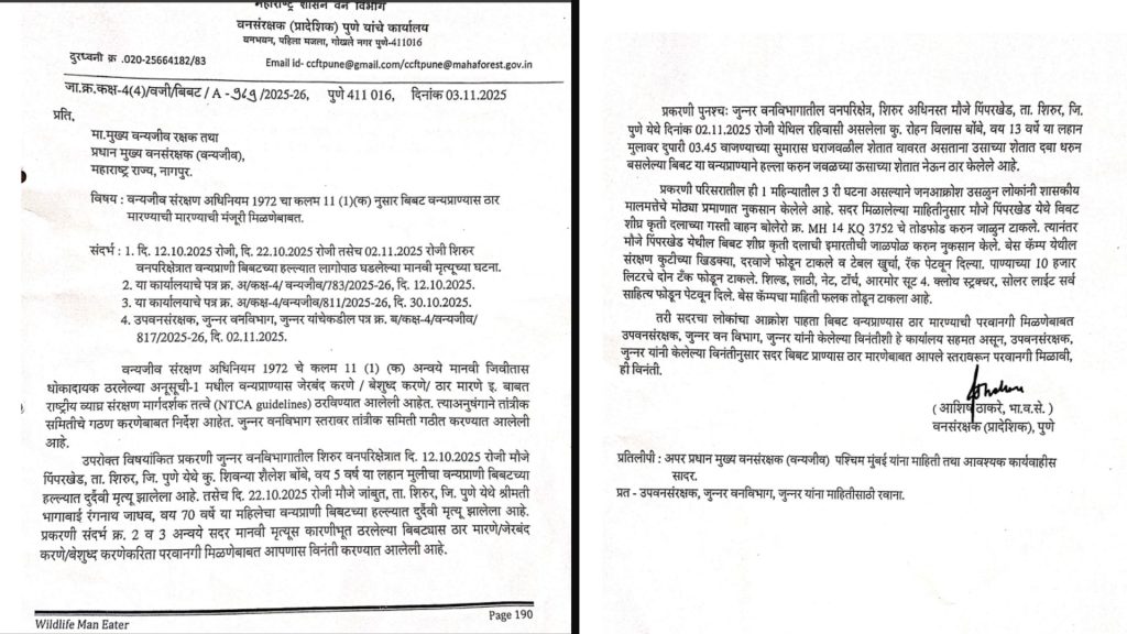 जुन्नर वनविभागातील शिरुर वनपरिक्षेत्राअंतर्गत मौजे पिंपरखेड, ता. शिरुर, जि. पुणे या परिसरात वावरत असलेला व मानवी जिवीतास धोकादायक ठरलेला बिबटयास तसेच गरजेप्रमाणे तंज्ञाचे उपस्थितीत व पर्यावरण व वन मंत्रालय, भारत सरकार यांचे मार्गदर्शक सुचनेत नमुद केल्यानुसार बेशुध्द करून बंदीस्त करुन घेण्याची अथवा जेरबंद न झाल्यास बिबटयास ठार करण्याची मंजुरी प्रदान करण्यात येत आहे. सदर आदेश दिनांक ३१ डिसेंबर, २०२५ पर्यंत वैध राहतील. असे वनविभागाने काढलेल्या आदेशात म्हटले आहे.